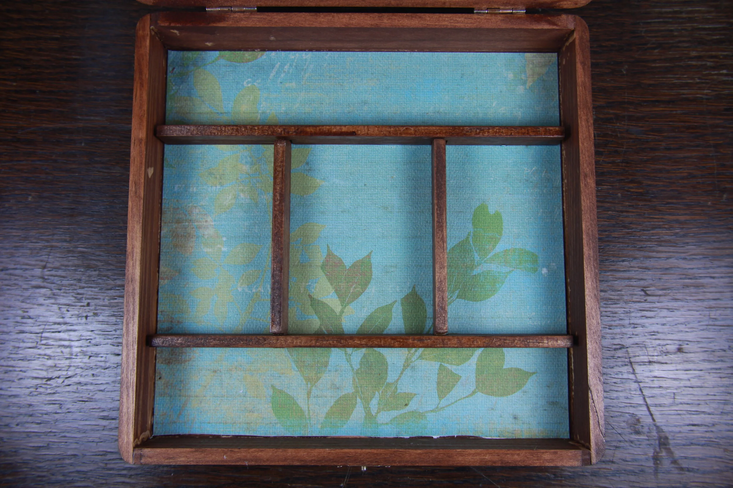 Custom built case with handmade inlays, dividers, and decorative accents.
